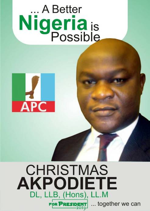 LAGOS JUNE 19TH (NEWSRANGERS)-Thirty Nine- Years- old All Progressive Congress(APC) Presidential candidate, Barr. Christmas Akpodiete has appealed to President Muhammadu Buhari to step down for him in the coming 2019 presidential election.