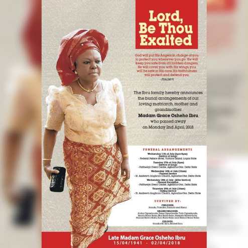 LAGOS JULY 19TH (URHOBOTODAY)-The quiet Agbarha-Otor community of the ancient Agbarha Kingdom in Ughelli North LGA of Delta state was recently a bee-hive of activities as the remains of late Madam Grace Osheho Ibru who passed away on April 2nd, 2018 was committed to mother earth in her community on July 18th, 2018.
