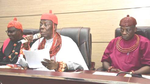 First Vice Chairman, Delta State Traditional Rulers Council and the Pere of Akugbene-Mein Kingdom, Stanley Perediegha Luke, Kalanama VIII(left); Chairman, Major-General Felix Mujakperuo (rtd) Orhue 1, and Obi of Ubulu-Uno, Henry Kikachukwu, at the traditional rulers meeting at the Council Secretariat in Delta State.