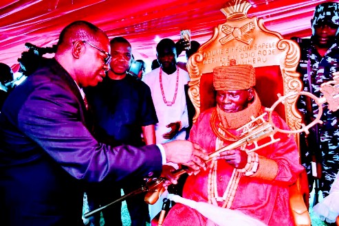 Deputy Governor of Delta State, Sir Monday Onyeme presenting Staff of Office to His Royal Majesty, Simpson Sapele Obruche, Obruche 11, the Odion R’ode of Uwheru Kingdom, Ughelli North Local Government Area of Delta State on behalf of Governor Sheriff Oborevwori on Friday, 14/07/23.