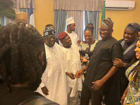 However, pictures shared by Prince Isaac Fayose on his Facebook page a few hours ago, show Tinubu being cordially received at the Government House in Port Harcourt by former Governors James Ibori (Delta), and Ayo Fayose (Ekiti), who also happen to be prominent chieftains of the PDP.