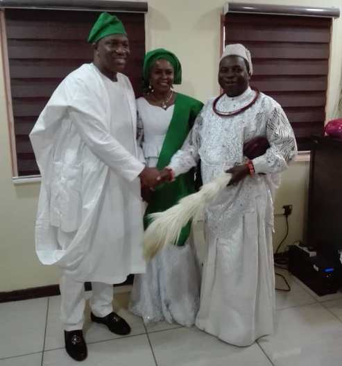 Osu R’Urhobo of Lagos, Chief Vincent Ahwi congratulating Mr Sam Egube and his wife after inauguration