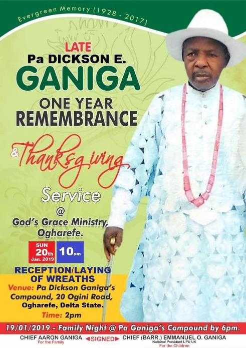LAGOS JANUARY 15TH (URHOBOTODAY)-President of Urhobo Progress Union in United Kingdom (UPU-UK), Chief (Barr) Emmanuel will on Sunday January, 2019 celebrate one year remembrance and thanksgiving service of his late father, Late Pa Dickson E. Ganiga.